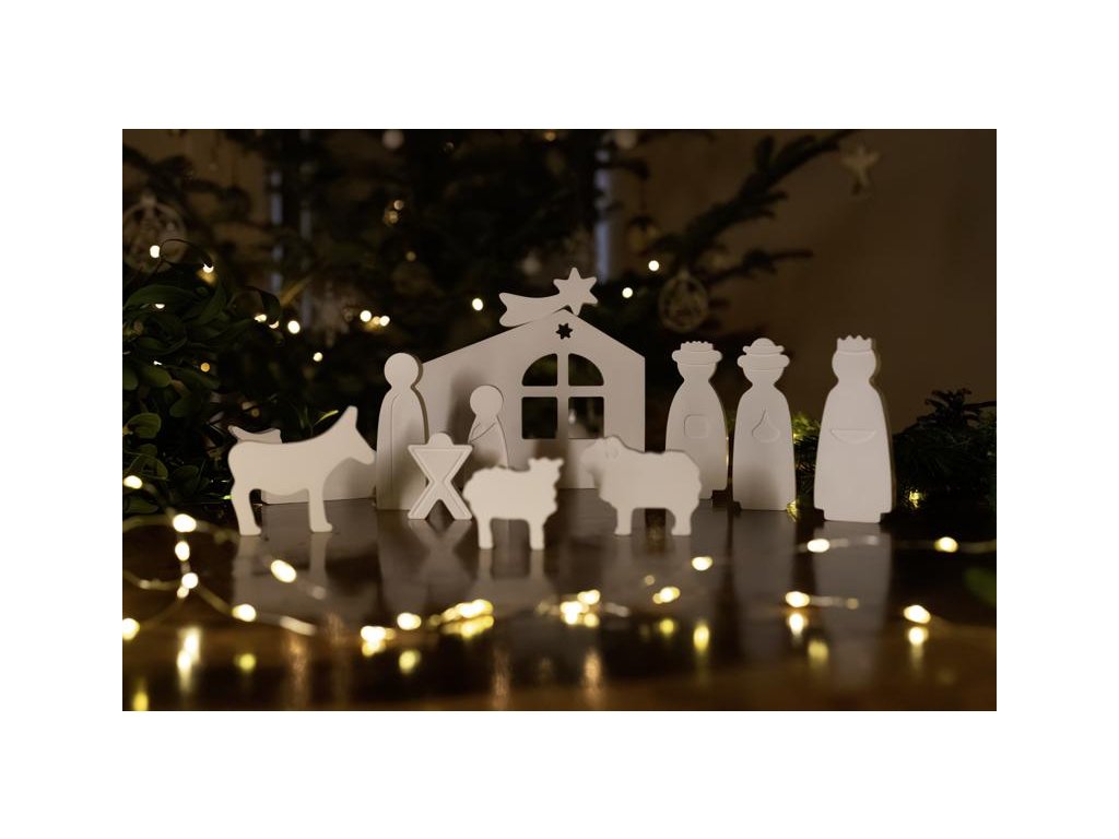 Betlém jsme pro vás zabalili do praktické dárkové krabice, která obsahuje: svatou rodinu (Josef, Marie, Ježíšek v jesličkách), tři krále, stáj, hvězdu a čtyři zvířátka (krávu, oslíka, berana a jehňátko)