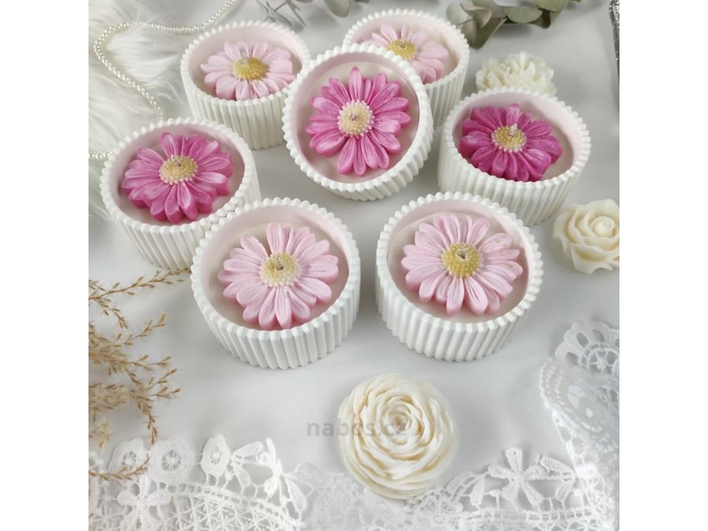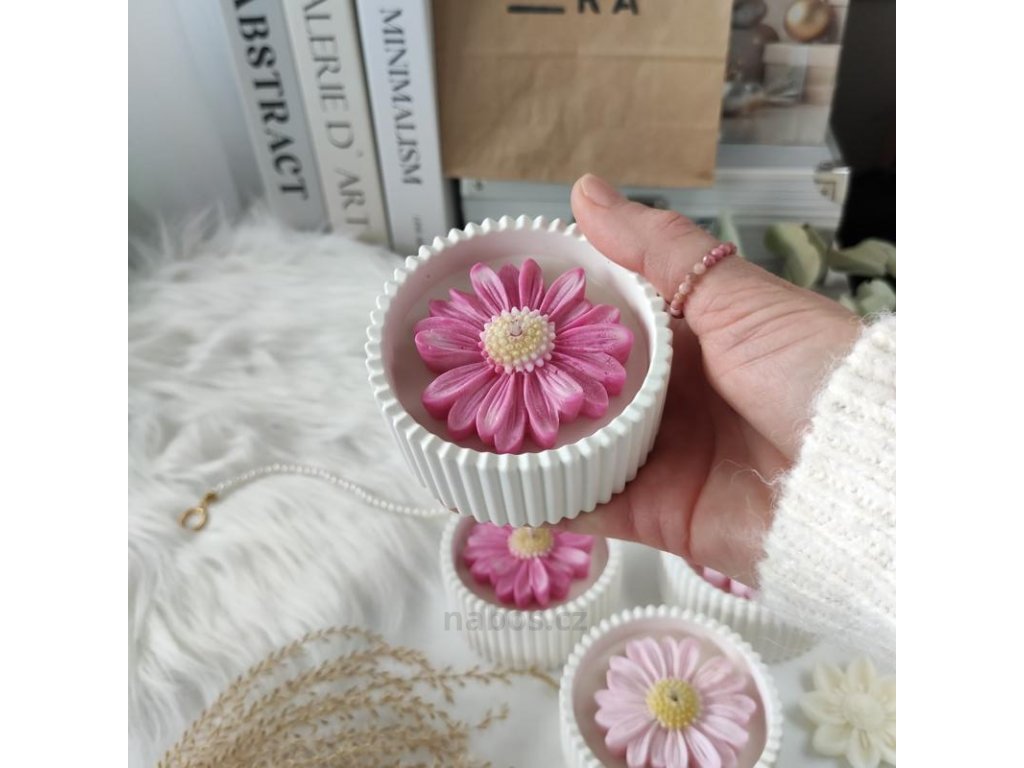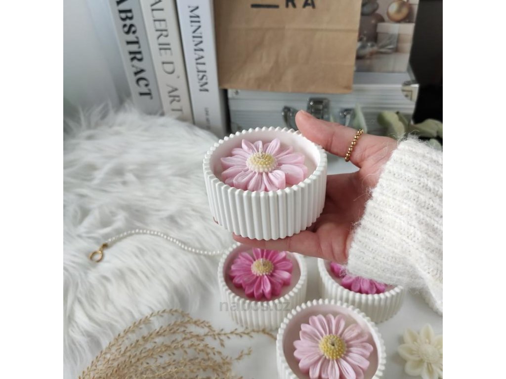 Ručně vyrobená sójová svíčka zdobená nádhernou voskovou kopretinou s příjemnou pudrovou vůní santalového dřeva a vanilky v minimalistickém obalu.