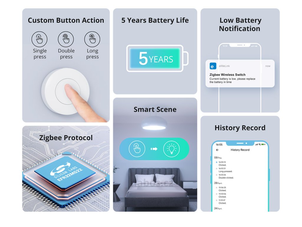 Chytré bezdrátové tlačítko SONOFF SNZB-01P Zigbee Wireless Switch nabízí 3 funkční stavy. Krátké stisknutí, dvojité stisknutí a dlouhé podržení. Díky tomu si lze na jednotlivé akce namapovat různé scény. Například osvětlení v celém domě zhasne, pokud tlačítko dlouho podržíte. Krátkým stisknutím můžete veškeré ZigBee žárovky opět rozsvítit. Je jen na vás, v čem vám chytré tlačítko SONOFF poslouží jak si jej nastavíte. Samozřejmostí je možnost nastavení chytrých scén - umístěte tlačítko třeba ke vchodovým dveřím a než odejdete, nechte jediným stisknutím vypnout světla, topení a zatáhnout rolety nebo jako domovní zvonek.